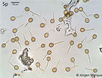 | Spore features | Ellipsoidal, warty, tapered stalk |