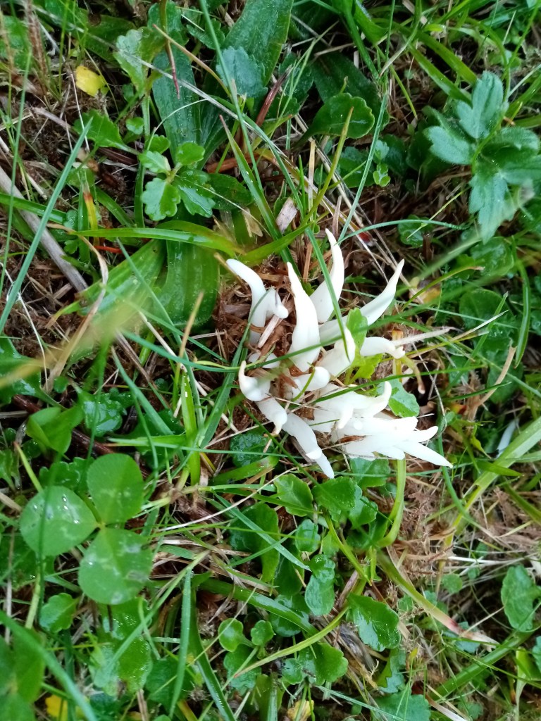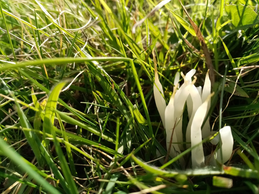 | Fruit body | 4-15cm, white (turning dirty-yellow when dried out), unbranched, slender, cylindrical, curving, yellowing at blunted/pointed tips, flesh is white and fragile |